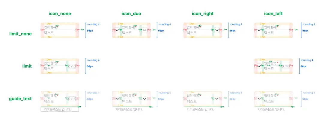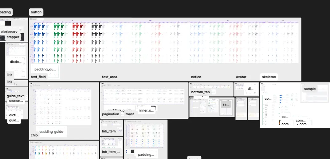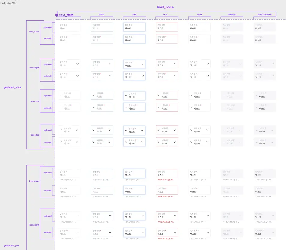 변수는 한번에 4~5개씩 적용되는 경우도 있기 때문에 일렬로 정리하는 것보다는 위 사진처럼 컴포넌트를 일종의 격자 형태로 x축과 y축에 따라 변수를 다르게 주어 정리하면 한 눈에 보기 더 편합니다. 이로써 개발자는 컴포넌트의 전체 스키마를 빠르게 파악할 수 있게 됩니다.