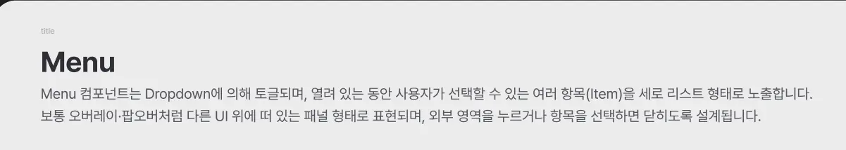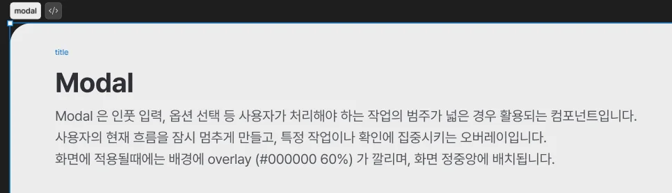 아무리 공통된 이름을 사용하더라도, 디자이너와 개발자가 해당 컴포넌트를 바라보는 관점은 다를 수 있습니다. 이를 방지하기 위해 각 컴포넌트의 핵심 역할과 사용 방법을 한두 줄의 텍스트로 명시하는 것이 좋습니다.