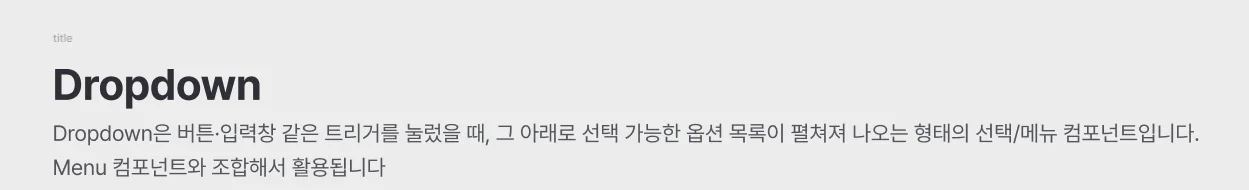 위와 같은 방식으로 ‘당연히 알고 있는 정의’ 라고 하더라도 컴포넌트가 사용될 때, 컴포넌트와 등장하는 현상을 정의하는 가이드를 작성했습니다.