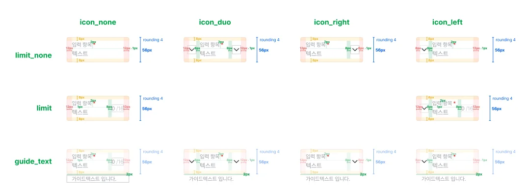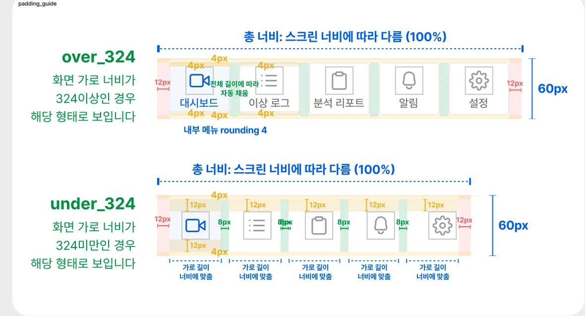 단순히 수치로 패딩 값을 설정해두는 작업을 끝내는 것보다, 영역 간의 간격과 정렬 기준을 직관적으로 시각화하여 보여주는 것이 훨씬 효과적일 것입니다. 개발자가 피그마 개발자 모드를 켜서 마우스를 올리는 수고를 덜어줄 수 있을 정도로 가이드 자체가 직관적이면 좋을 것이라 생각했습니다.