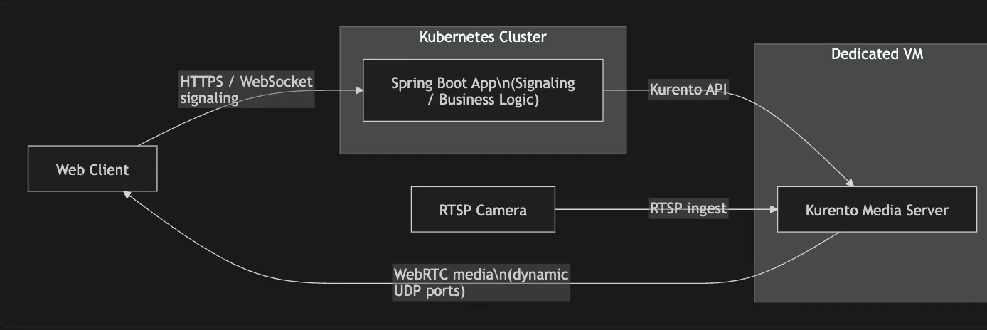 프로젝트 초기에 가장 현실적인 선택은 Kurento만 별도의 VM에서 운영하는 것이었습니다. 쿠버네티스 안에는 Spring Boot 애플리케이션을 두고, 실제 미디어 처리는 VM 위의 Kurento가 담당하도록 역할을 나눴습니다.