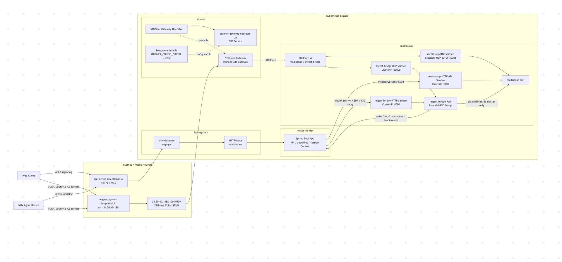 웹브라우저 경로는 WebRTC -> STUNner -> mediasoup, nuv-agent 장치 uplink 경로는 WebRTC -> STUNner -> ingest-bridge -> mediasoup로 정리됐고, 그 위에서 연결 품질과 재생 품질을 함께 다듬기 시작했습니다.